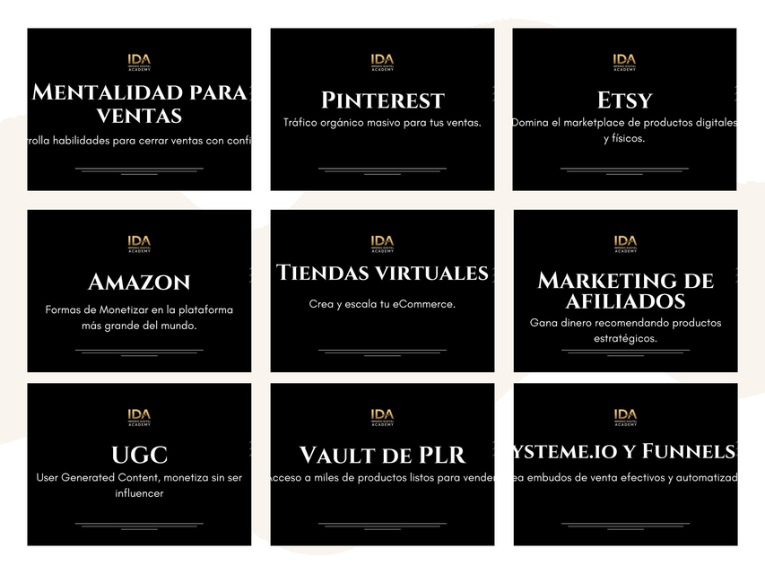 ✅ Cursos completos en e-commerce, afiliados, CPA, UGC, branding, marketing y más.